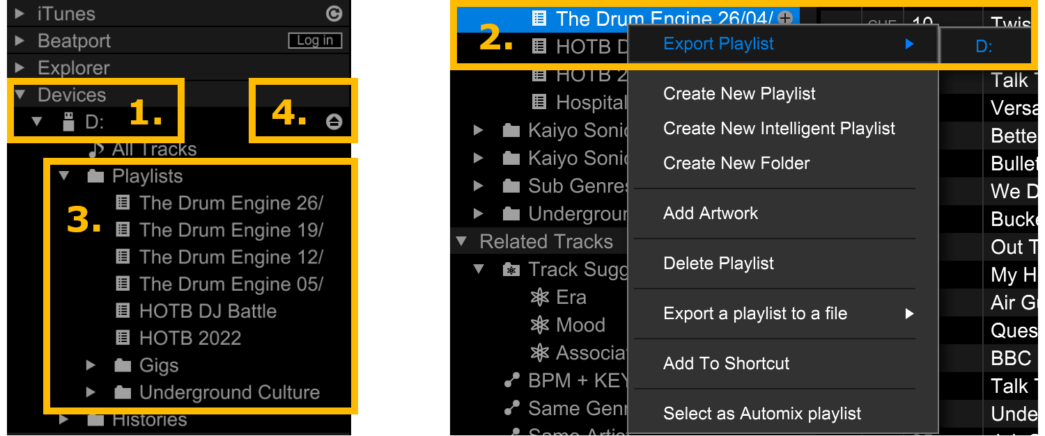 Right click on the playlist you’d like to export, hover over ‘Export Playlist’ and click on your USB device. You can do this for playlists you’ve already imported to your Rekordbox collection, as well as iTunes playlists or folders on your computer.